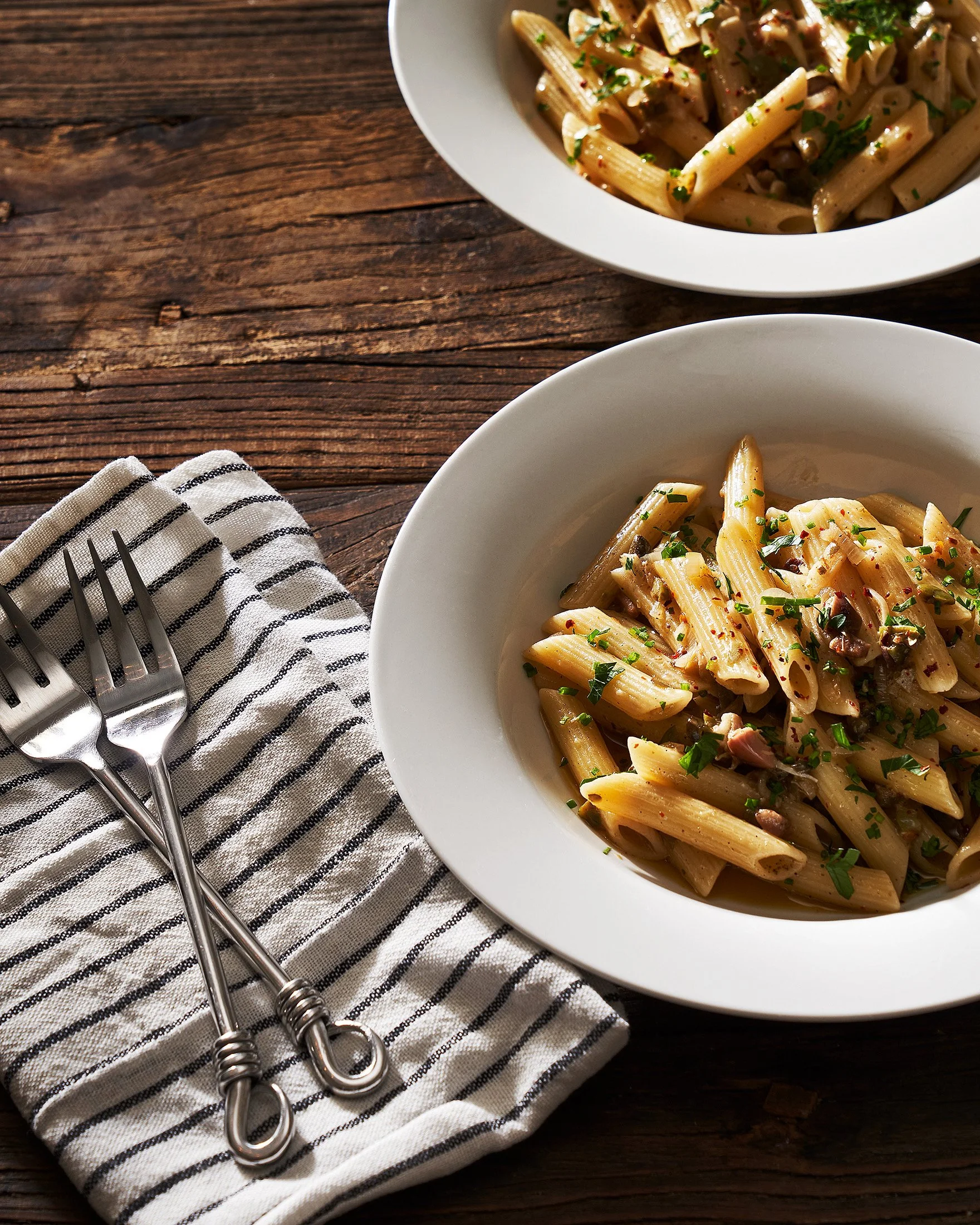 Scrounging in the pantry for dinner is something my husband abhors, so it's become one of my favorites. I like to scrap together random crap and then present my masterpiece. This pasta almost fits that bill, but you have to have fresh parsley and chives. It's also a recipe that everyone purports is easy to make good, but I think it requires more skill and effort than is advertised. I've made it for years in an attempt to make it taste as good as it looks and sounds. I think I'm finally there. But I didn't follow the recipe, exactly. Measured is an aspiration.